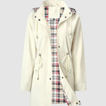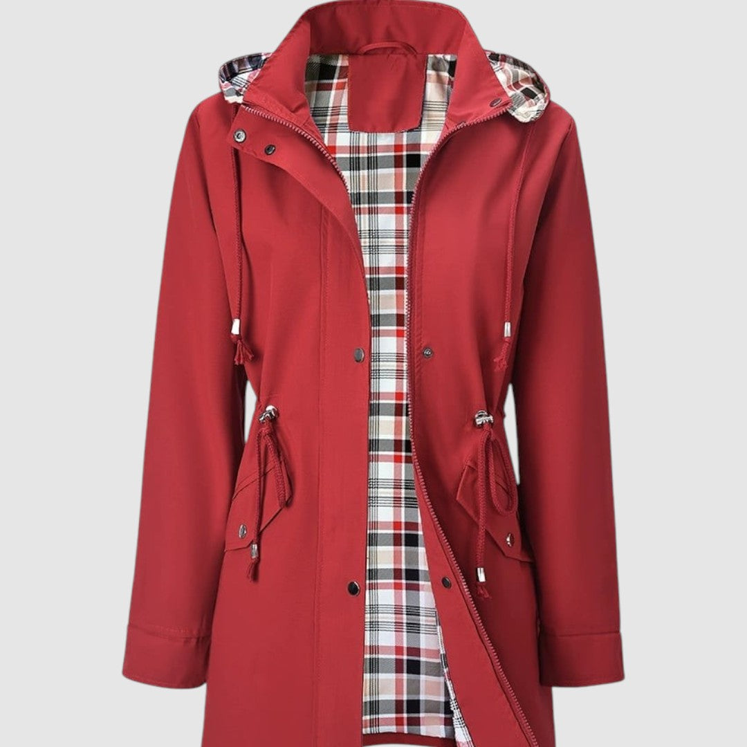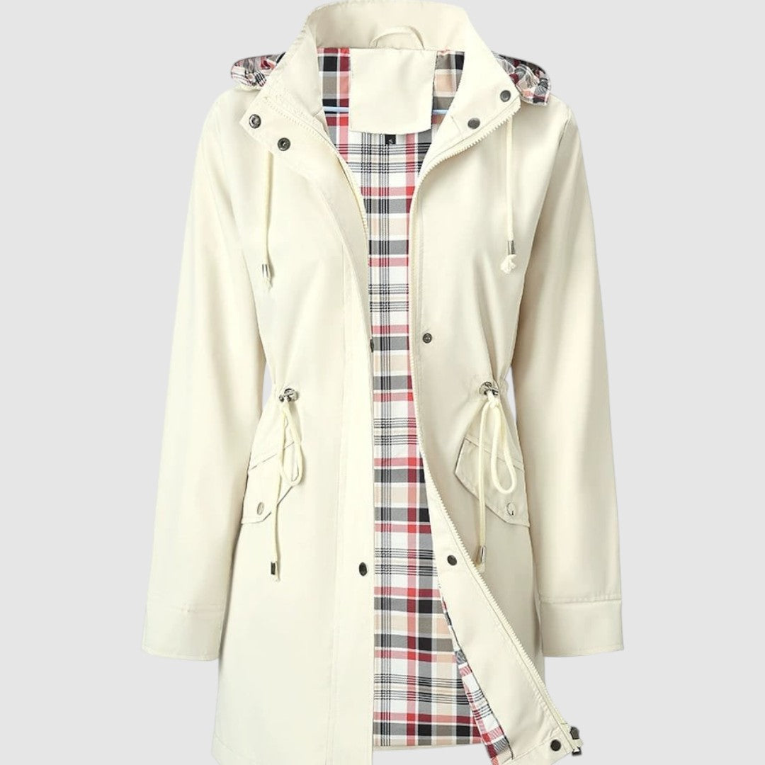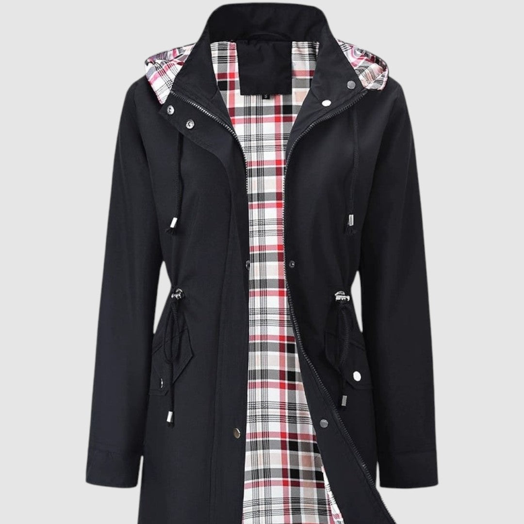 Tento kabát je ideální volbou pro deštivé a větrné dny. Díky nepromokavému materiálu vás spolehlivě ochrání před nepřízní počasí, zatímco praktická kapuce a stahovací pas dodávají funkčnost i ženský vzhled. Vnitřní podšívka s kostkovaným vzorem zajišťuje pohodlí a originální styl.