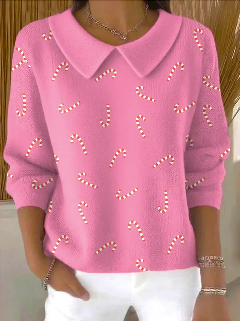 Elena je pletený vánoční svetr z měkké směsi bavlny, ozdobený opakujícím se vzorem klasických cukrových hůlek. Límec dodává celku elegantní a lehce nostalgický vzhled, který se skvěle hodí k útulné sváteční atmosféře.