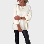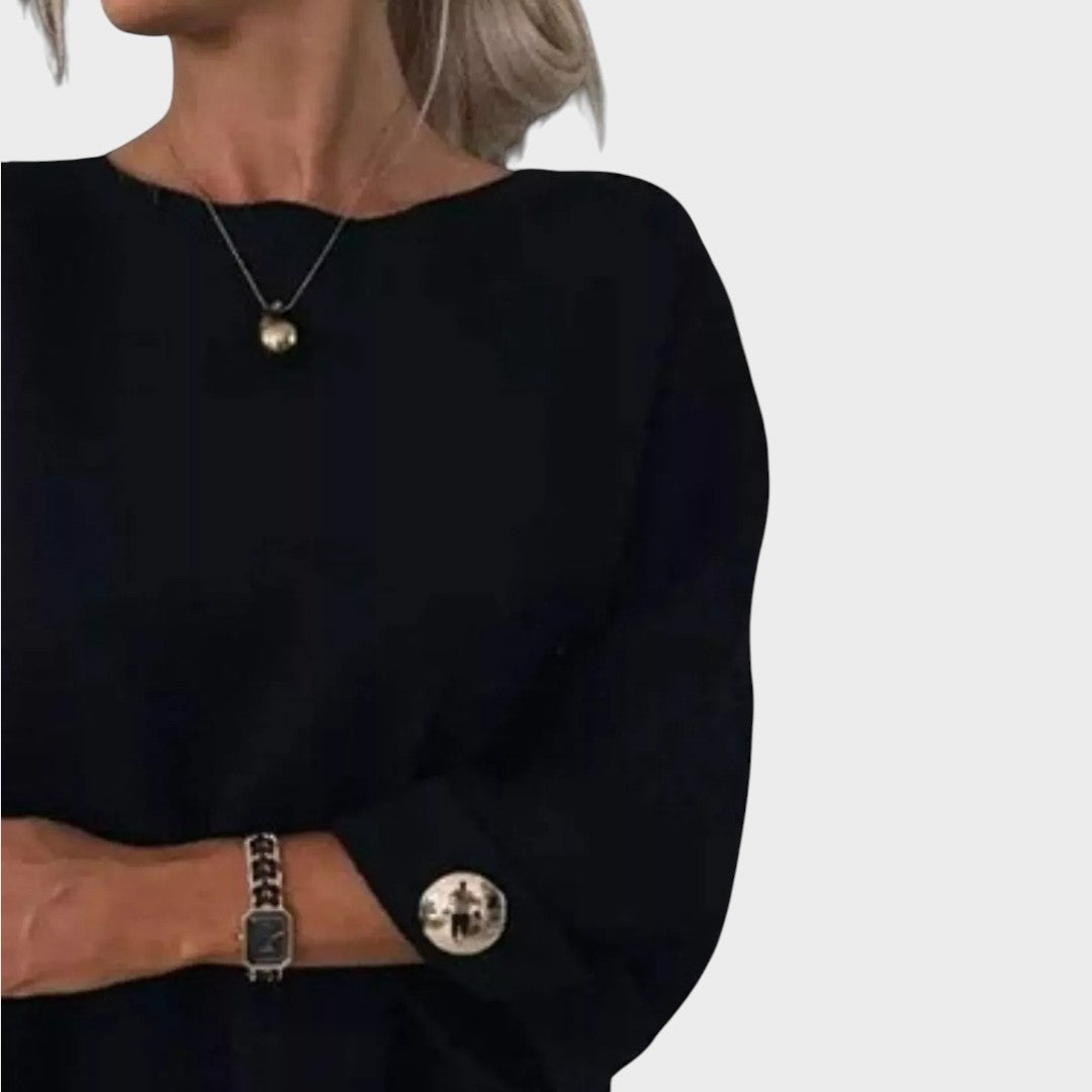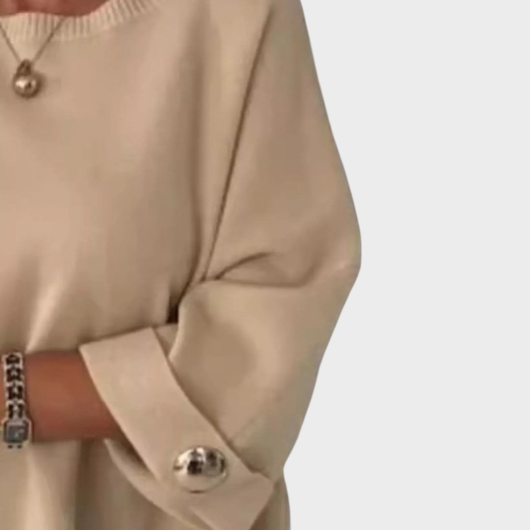 Svetr Adelaide je definicí jednoduché elegance a moderního pohodlí. S volným a splývavým střihem vyniká minimalistickým designem a jemnými detaily na manžetách s dekorativními knoflíky, které dodávají vzhledu sofistikovaný nádech.