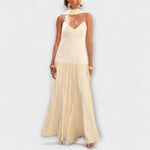 Elegance v pohybu—Dlouhé maxi šaty Fía Flows jsou vaším prohlášením pro bez námahy elegantní vzhled. Vyrobené z lehkého šifonu a hedvábného saténu, tato kráska v barvě máslové žlutě se pohybuje s každým krokem, zachycuje světlo a přitahuje pozornost.