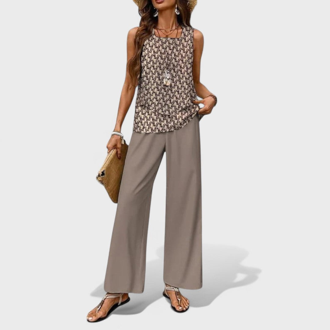 Set Katarína přináší luxus jednoduchosti a pohodlí ve stylové kombinaci. Horní část bez rukávů jemně obepíná postavu, zatímco lehké kalhoty s volným střihem dodávají pocit vzdušnosti a svobody. Vyrobený z kvalitního materiálu s jemným leskem, tento set je skvělou volbou pro pracovní dny, setkání s přáteli či letní večery plné elegance.