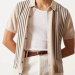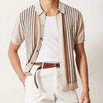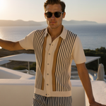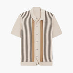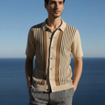 Dokonalá rovnováha retro inspirace a moderního řemesla, toto pletené polo triko pozdvihuje každodenní oblékání. Navrženo s lehkým pocitem a složitými kontrastními pruhy, je ideální pro vrstvení v teplém počasí nebo pro elegantní neformální nošení.
